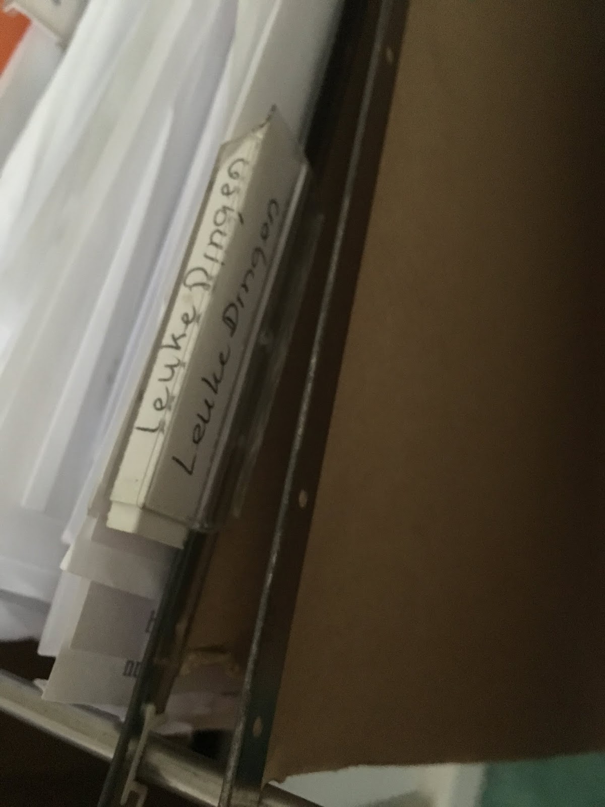 OPRUIMEN, ja dat moet soms. Het begin van het jaar is een goed moment om mijn administratie bij te werken. Ik heb een foto gemaakt van mijn 50 hangmappen, ik heb ze zojuist geteld, tjeetje had geen idee dat het er precies 50 zijn! Ik wilde eigenlijk vandaag schrijven over het Higgs deeltje dat ze hebben gevonden in Genève, maar dan wordt het allemaal zo’n zware kost, dus vandaag over het heerlijke opruimen. Ja, ik vind dat echt heel leuk werk. Alles netjes in de hangmappen stoppen. Of in ordners. Ook die heb ik voor deze gelegenheid geteld. Dat zijn er 9. Sommige mappen worden te vol en dat is nu het Nieuwjaarswerkje. Die mappen opschonen, weggooien of de inhoud verplaatsen. Mijn lievelingsmap is “leuke dingen” Ook een foto! De map “leuke dingen” heb ik al heel lang. Ik heb dat ooit geleerd van een secretaresse die mij thuis hielp, toen ik ongeveer 10 bijbaantjes had (de meeste onbetaald).