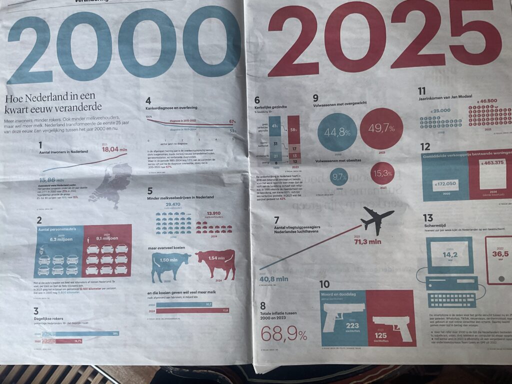 - Ik ben dol op lijstjes. Dus tussen Kerstmis en Oud en Nieuwjaar geniet ik van alle lijstjes. Niet alle lijstje interesseren mij natuurlijk! De Top 2000 zijn bijzonder oninteressant, vind ik! Een top liedjes lijst uit de jaren 50 zou ik super leuk vinden, maar dat bestaat niet meer. De verschillen tussen het jaar 2000 en 2025 hierboven zijn interessant: in plaats van minder, hebben we nu nog meer koeien en auto’s en mensen!! En het aantal vliegtuigpassagiers is ook gigantisch toegenomen. Toen ik 12 jaar was, was ik in de vaste overtuiging dat ik het jaar 2000 nooit zou halen. ik zou dan allang dood zijn en nu… 2025 ben ik er nog steeds en heel tevreden.